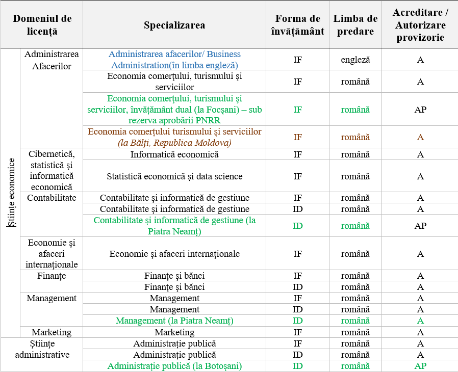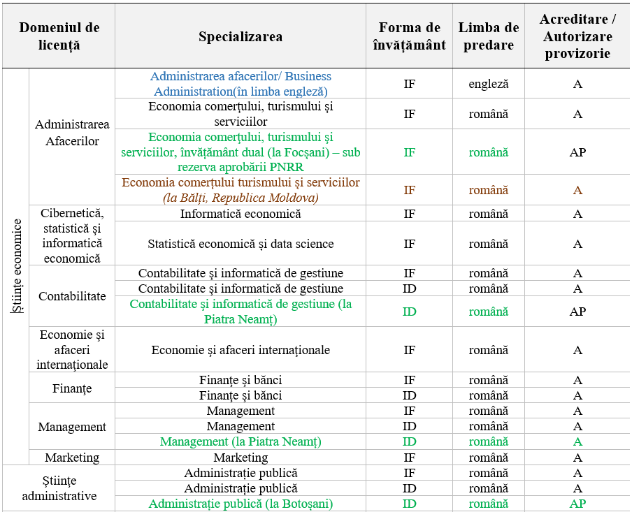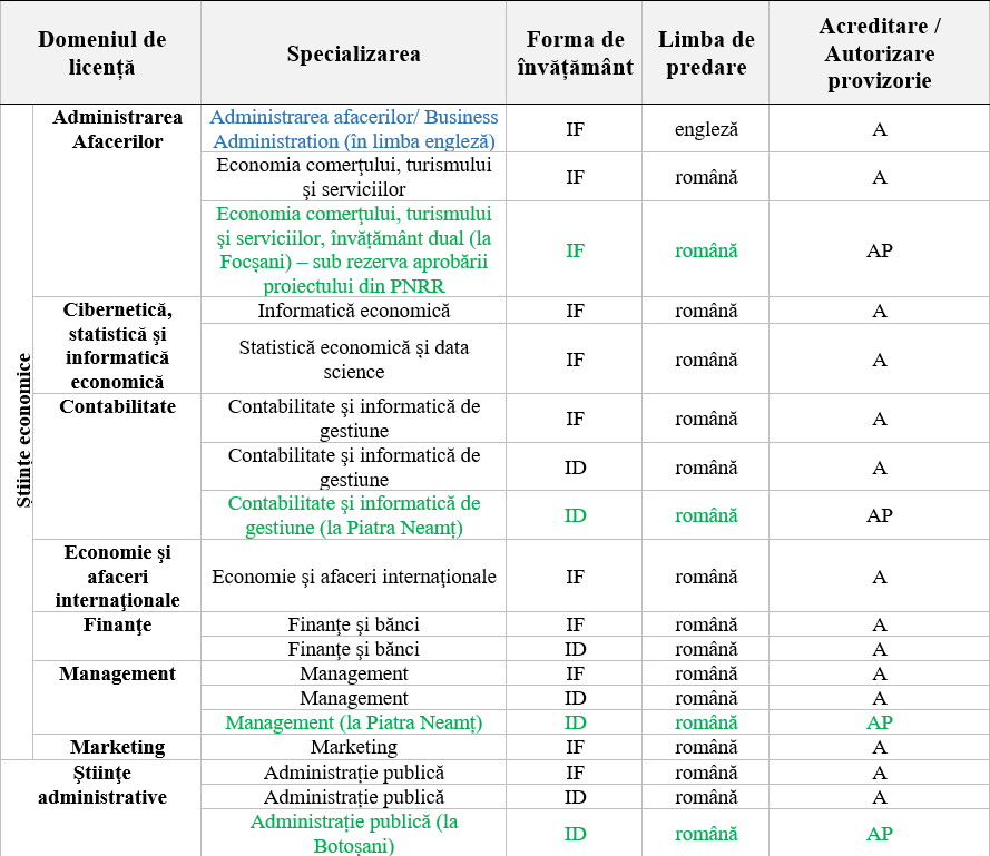 Oferta educaţională a Facultăţii de Economie şi Administrarea Afacerilor (FEAA) este una extrem de bogată şi de variată. Ai oportunitatea de a alege dintre cele 10 specializări de licență exact ce îţi place şi ce ţi se potriveşte. Fie că este Contabilitate şi informatică de gestiune, Economie şi afaceri internaţionale, Economia comerţului, turismului şi serviciilor, Finanţe şi bănci, Informatică economică, Management, Marketing, Statistică şi previziune economică sau Administraţie publică, vei descoperi un corp profesoral bine pregătit, care te va îndruma spre alegerea corectă a viitoarei cariere. De asemenea, la FEAA puteți studia o specializare în limba engleză , Business Administration. Pot fi urmate cursuri la zi (învațamânt cu frecvență) sau la forma învățământ la distanță.