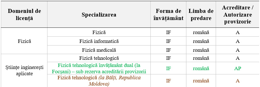 Pregătirea în cadrul Facultăţii de Fizică se realizează prin intermediul unei largi palete de cursuri de fizică, punându-se un accent deosebit pe partea practică și pe domeniile de perspectivă (fizică medicală, biofizică, fizică informatică şi fizică tehnologică), precum şi prin cursuri de matematică, informatică, chimie, biologie sau limbi străine.