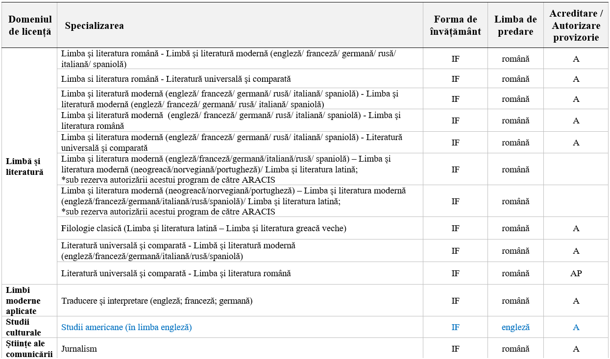 Pentru programul Studii americane (în limba engleză) este necesară dovada că s-a studiat Limba engleză cel puțin 2 ani în perioada studiilor liceale.