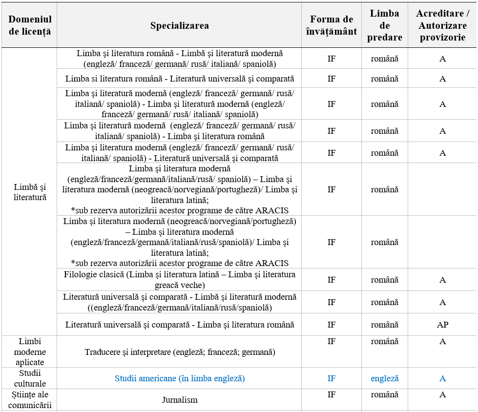 Pentru programul Studii americane (în limba engleză) este necesară dovada că s-a studiat Limba engleză cel puțin 2 ani în perioada studiilor liceale.