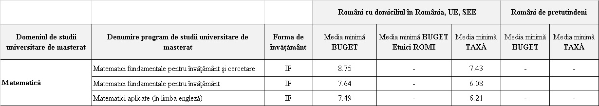 *Condiție eliminatorie pentru programul Master de cercetare în matematică: minim nota 8.50 la fiecare din cele doua probe de concurs.