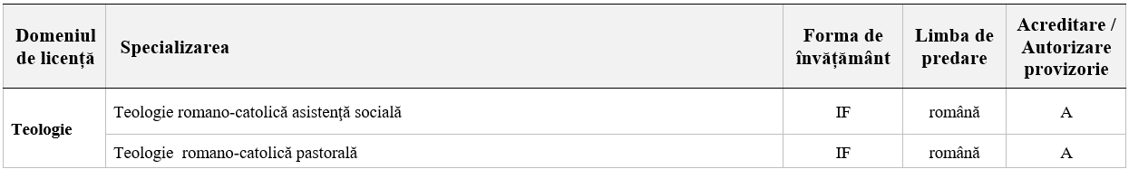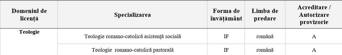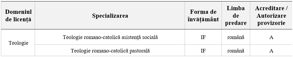 La Facultatea de Teologie Romano-Catolică poți urma studii universitare de licență, cu următoarele specializări: Teologie romano-catolică pastorală (4 ani) și Teologie romano-catolică asistență socială (3 ani), precum și studii universitate de masterat: Teologie romano-catolică practică și misionară (2 ani).